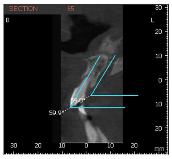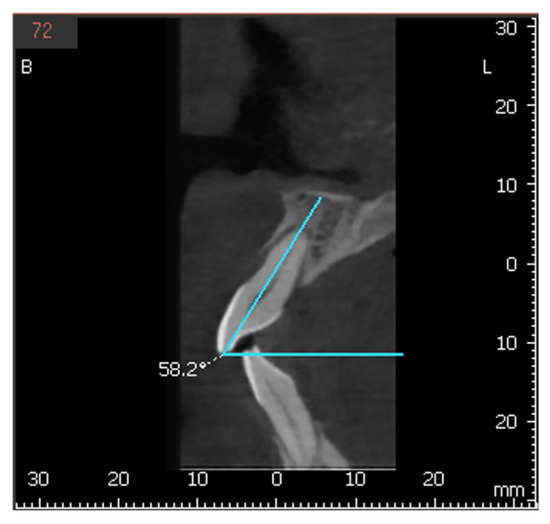The longitudinal axis of each incisor was defined as the line connecting the incisal edge with the root apex, while the axis of the NPC was defined by marking a line between the nasopalatine foramen, superiorly, to the incisive foramen inferiorly. The MDI of 1.1 and 2.1 was calculated as the angle between their longitudinal axis and a transverse reference plane passing through the midline of the maxilla. The same measurement was applied to the NPC relative to this plane (Figure 3). The VPI of 1.1 and 2.1 was determined as the angle between their longitudinal axis and the horizontal plane, with the NPC measured in the same manner (Figure 4 and Figure 5).