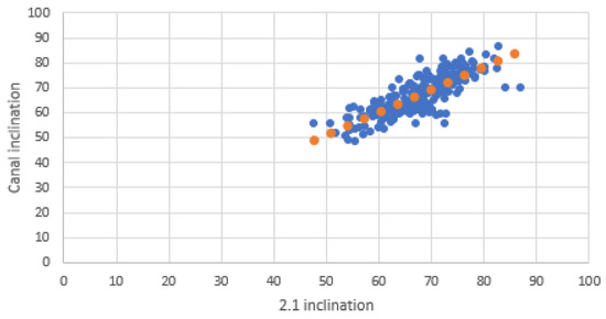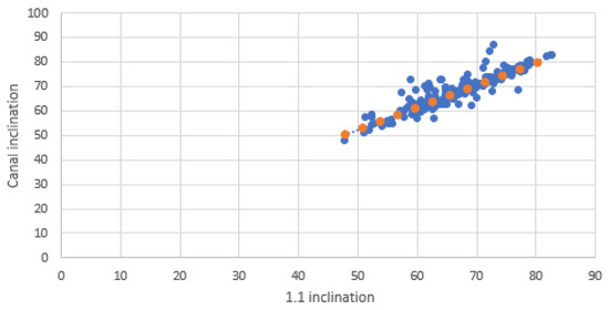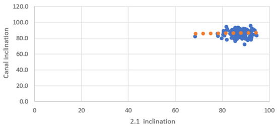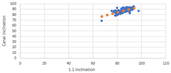 In the buccopalatal direction scatter plot, the inclinations of 1.1 and 2.1 exhibit strong alignment with those of the NPC, confirming the high correlation observed in Pearson’s analysis (Figure 6 and Figure 7).
