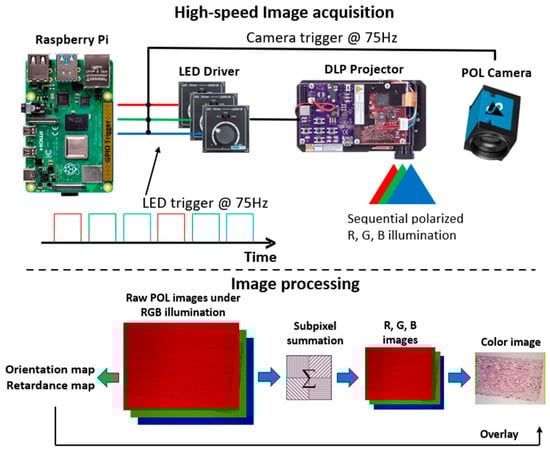 Upper panel: Core ColorPOL imaging system configuration. Illumination and image acquisition are synchronized through a trigger signal generated with a Raspberry Pi at 75 Hz. Lower panel: Pipeline of image processing and visualization. Color images are generated using polarization images under R, G, and B illumination. The polarization image under green illumination is used to derive the fiber orientation map and retardance map, which are overlaid on the corresponding color image.