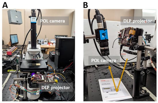 Wide-field imaging configuration (reflection mode): In this configuration, the projector was slightly angled (around 15 degrees) to provide a uniform illumination that covered the entire field (approximately 7 cm × 11 cm) (Figure 2B). A circular polarizer was placed directly before the projection lens. We used a 35 mm C-mount lens (HF35HA, Fujinon, Tokyo, Japan) for image acquisition. The aperture of the lens was adjusted to ensure a sufficient depth of field. During testing, the imaging setup continuously acquired images at 75 FPS until it was stopped.