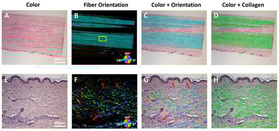 Tendon section and human skin section imaged with ColorPOL microscope with a 4× objective. For each sample, figure shows the following: (A,E) reconstructed color images; (B,F) fiber orientation maps; (C,G) merged visualization of fiber orientation map over the color image; (D,H) merged visualization of collagen content over the color image. Red arrows indicate regions with lower collagen content.