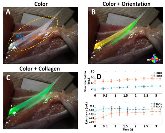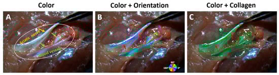 Unlike tendon tissues, sciatic nerve and blood vessel tissues have a more complex tissue composition with less collagen content [,,]. As a result, the retardance values are lower, making it more challenging to separate collagen content from the non-collagenous tissues. Figure 5 shows one frame extracted from the video (Video S2), visualizing the sciatic nerves and blood vessels being pulled. Similar to the chicken tendon demonstration, the video simultaneously shows three visualization options: color (Figure 5A), orientation overlay (Figure 5B), and collagen overlay (Figure 5C). The overlay was only applied to an oval region shown in Figure 5A to improve the processing speed and highlight the region of interest. The fiber orientation overlay (Figure 5B) not only shows the quantitative local fiber orientation, but it also makes tissue features such as crimp more visible (red arrows in Figure 5B), which were otherwise almost invisible in the color image. It is worth noting that due to the complexity of collagen organization in these tissues, the quantified local collagen orientation may not align with the apparent longitudinal shape of the nerve and the vessel [,]. Overlaying the collagen content (Figure 5C) over the color tissue image further enhanced the contrast and visibility of the nerve and the vessels. Due to specular surface reflections, sparse non-collagen regions are also visible and shown in green. These non-collagen regions could be effectively suppressed with an improved segmentation.