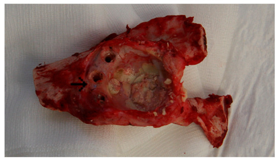 Eight months after implantation, euthanasia was carried out immediately after sedation of the sheep by the rapid application of embutramide (T61, Intervet Deutschland GmbH, Unterschleißheim, Germany) via an intravenous catheter in an overdose of 10–15 mL. Before µ-CT evaluation, the inlying implants were explanted to allow the best possible assessment (Figure 1).