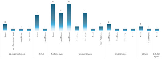 | [80] | Wireless Intelligent Cardiopulmonary Auscultation Anthropomorphic Dummy | Henan Yujing Technology Development | Heart–Lungs | Mannequin simulator | Electronics |