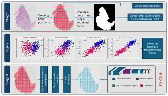 Overview of the proposed three-stage pipeline for tumor region processing and classification. Stage 1: Patch positions are created from the whole slide image (WSI), and a tumor mask is generated using a pretrained model. Tumor regions are identified, and patch positions and tumor patches are saved for downstream processing. Stage 2: An evolutionary algorithm (EA) is used to optimize a transformation matrix by iteratively clustering feature embeddings across generations, leading to better separation between the two classes of labeled data. The final transformation matrices are saved. Stage 3: Features are extracted from the saved patches, followed by dimensionality reduction using the saved transformation matrices and graph formation based on spatial positions. A 1-Dimensional Convolutional Neural Network (1D-CNN) is then applied for classification.
