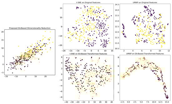 To place the proposed EA projector in context, we repeated the entire dimensionality reduction workflow with two standard reference techniques. For the linear baseline, we used Linear Discriminant Analysis (LDA) by applying the scikit-learn module []. We applied the model to the extracted DenseNet-121 features and exported the learned transformation matrix for later use on the test set. This guarantees a projection of, at most, dimensions, where C is the number of classes. The nonlinear comparator was the Uniform Manifold Approximation and Projection (UMAP), with default parameters of the Euclidean metric and 15 neighbors. The embedding dimensionality matched that of the proposed EA [].