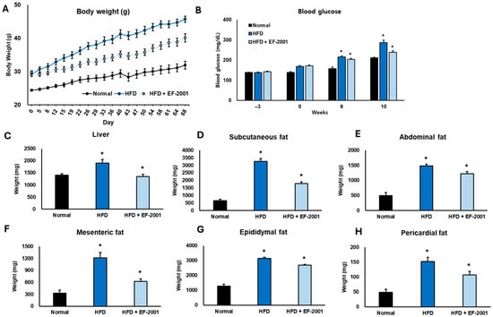 3.2. Effect of EF-2001 on Blood Glucose in HFD-Induced Obese Mice