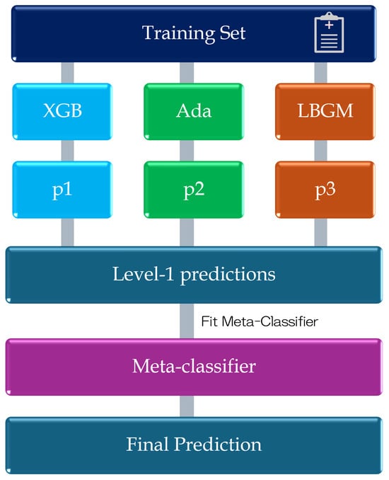 Ensemble learning integrates multiple models to boost predictive performance. Among available strategies, stacking employs a meta-classifier that synthesizes the outputs of several base classifiers, forming a robust architecture known as a stacking ensemble model. This approach effectively harnesses the complementary strengths of diverse algorithms. In our framework, XGBoost (learning rate = 0.1, maximum depth = 6) [], AdaBoost (31 leaf nodes, feature subsampling rate = 0.8) [], and LightGBM (50 boosting iterations) [] are adopted as base classifiers, with logistic regression serving as the meta-classifier with its regularization parameter set to . To enhance both predictive accuracy and model generalizability, particularly under high-recall constraints, we implemented this stacking ensemble structure, as depicted in Figure 2.