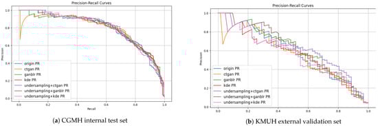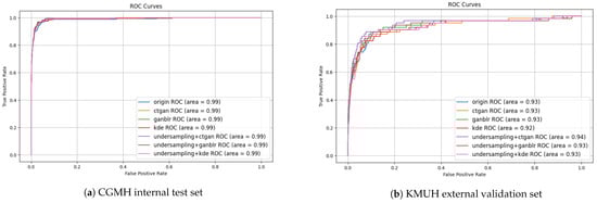 To further support the quantitative metrics reported in Table 4, we generated Receiver Operating Characteristic (ROC) and precision–recall (PR) curves (Figure 3 and Figure 4), which offer a visual summary of classifier behavior under different combinations of data augmentation and sampling approaches on both the CGMH and KMUH datasets.