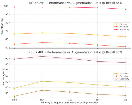 Performance comparison across different augmentation ratios on CGMH and KMUH datasets (recall = 85%).