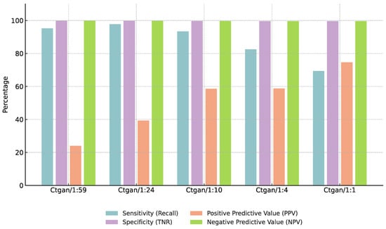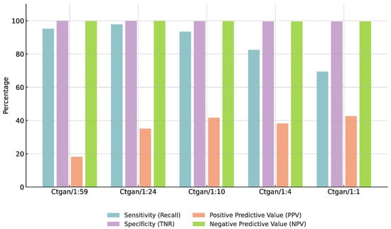 We evaluated five positive-to-negative sample ratios (1:59, 1:24, 1:10, 1:4, and 1:1) using the fixed Euclidean-CBU + CTGAN configuration (Section 3.3). As shown in Table 18 and illustrated in Figure 10 and Figure 11, the 1:24 ratio achieved the highest F1-score, precision, and specificity on both the CGMH and KMUH datasets. When ratios exceeded 1:24, both F1 and recall declined—despite minor precision gains—suggesting overfitting and less distinct decision boundaries (as demonstrated by a 5.2% decrease in F1-score at a 1:4 ratio and an 8.7% decline in recall at a 1:1 ratio on the KMUH dataset).
