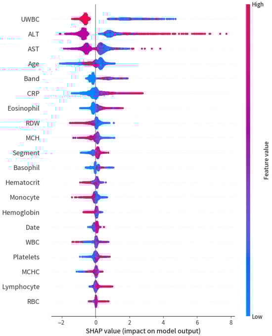 SHAP summary plot of feature importance from the final LightGBM model. The top-ranked predictors included UWBC, ALT, AST, age, and band neutrophils. Each dot represents a patient, with color indicating the feature value (red = high, blue = low), and x-axis indicating its impact on model output.