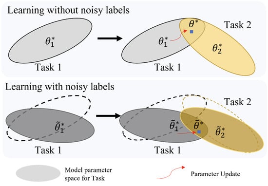 Figure 1, noisy labels disrupt parameter constraints in incremental learning, thereby exacerbating catastrophic forgetting.