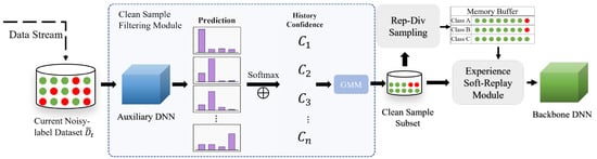 To maintain class balance, this study constructs the clean-sample replay memory buffer of total size . Specifically, the study allocates an equal number of memory blocks to each class in the trained model. For the clean-sample subset of the current task t, a sampling strategy that balances both diversity and representativeness is followed. First, the uncertainty for each sample is computed, and the samples are then sorted based on their uncertainty values. Next, memory quotas are adjusted and diversity sampling is performed. The number of memory samples allocated to each class is redistributed based on predefined interval sizes as , where is the total number of learned classes. For the new sample space, samples from the sorted list according to the sampling intervals are selected, ensuring that samples are drawn from the entire uncertainty spectrum (ranging from low-uncertainty robust samples to high-uncertainty fragile samples). This sampling strategy aims to systematically cover samples across different levels of uncertainty, ensuring both the diversity and uncertainty of the samples in the replay memory buffer. However, it is important to note that since this method aims to capture a broad range of samples, including “fragile” (high-uncertainty) ones, it may inadvertently introduce latent noisy-labeled samples into the memory buffer that were not completely removed during the initial clean-sample subset selection phase.