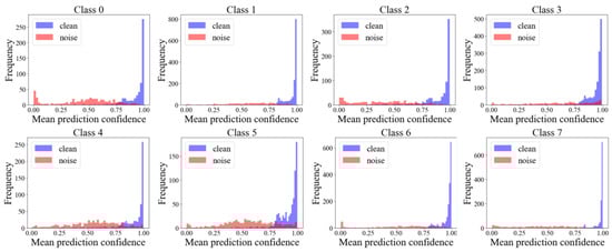 , this represents an average reduction of 72.77% compared to the original noise ratios, with a maximum reduction of 80%. The network tends to select high-confidence, clean samples, providing a higher-quality data foundation for training the main classification network, which, in turn, improves its classification performance.