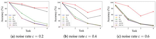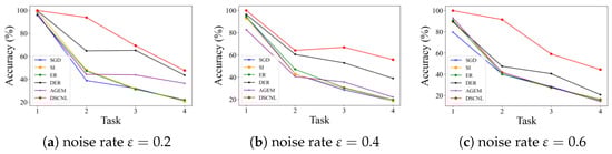 Figure 4, a clear comparison of the average accuracies after each incremental task is presented for different noise rates. This visualization reinforces the DSCNL method’s persistent outperformance under noisy conditions.