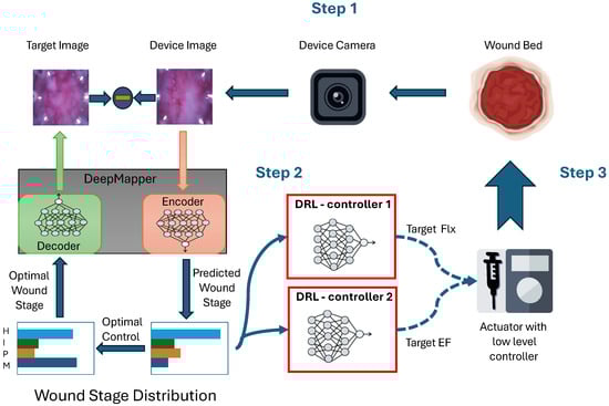 We generalized the DeepMapper method from [23], eliminating the need for a control–affine matrix. Our results demonstrate its ability to learn a linear representation of nonlinear wound-healing dynamics from a time-series of images monitoring wound closure in vivo. By leveraging optimal control and the decoder mechanism within DeepMapper, we derived an optimal reference signal that the DRL agent used to generate real-time treatment strategies. This approach not only improved the accuracy of the linear representation for modeling wound dynamics under optimal treatments but also enhanced the efficiency of the reinforcement learning agent. We validated the efficacy of our approach with experimental data. Simulations of nonlinear healing dynamics with adaptive interventions showed that the proposed method accelerated wound healing by 17.71% compared to the normal healing process. Additionally, the proposed framework has successfully been implemented in in vivo porcine experiments, demonstrating our method’s potential for translation to clinical settings [24]. The proposed framework showcases the significant potential to expedite wound healing by effectively integrating optimal control and data-driven methods. By leveraging advanced algorithms that adapt in real time to changing conditions, this system offers a more accurate and reliable means of promoting faster recovery that lacks the limitations of conventional models.