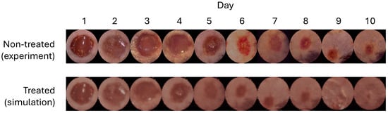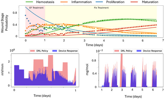 Figure 6 shows the comparison of control wounds with DRL-treated wounds. The results presented are from two experiments. In each experiment, there were two control wounds and two treated wounds. Multiple images were taken each day, and results were averaged across all wounds and experiments for days 1–7. Images from Day 7 are shown for visual comparison and validation of the model’s predictions. The bright red, shiny surface of the control wounds is an indicator of inflammation, while the softened edge of the treated wound serves as an indicator of proliferation. Thus, the DRL-based action supported the accelerated onset of inflammation and transition to proliferation. We note that the DRL algorithm resulted in a steady and constant delivery of fluoxetine. Previous work suggests that this is an optimal strategy and that it is more effective than bolus dosing [11,12]. This result suggests that the proposed algorithm provided a treatment strategy that effectively accelerated the healing process.