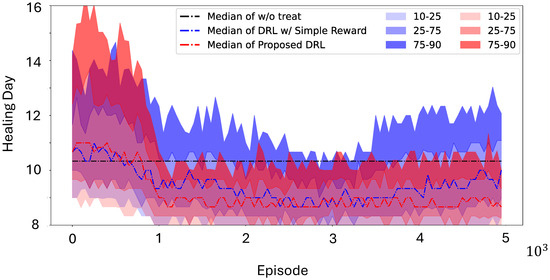 Learning curves of DRL agents over the mouse dataset with a predefined function of treatment effect, shown by percentile. Without any treatments, it would take 10.33 days for one mouse wound to heal. Our proposed method, shown in red curves, results a treatment policy that is more stable than the DRL agents implemented without the leader–follower strategy.