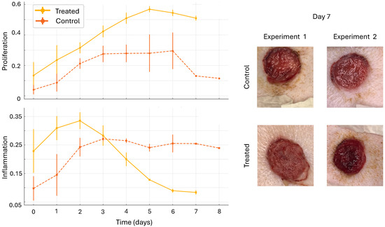 Comparison of control wounds with DRL-treated wounds. The results presented are from two experiments. In each experiment, there were two control wounds and two treated wounds. Multiple images were taken each day, and results were averaged across all wounds and experiments for each day. Missing data points are omitted. Error bars indicate one standard deviation. Images from Day 7 are shown. The bright red and shiny surface of the control wounds is an indicator of inflammation, while the softened edge of the treated wound serves as an indicator of proliferation. Thus, the DRL-based action supported the accelerated onset of inflammation and transition to proliferation.