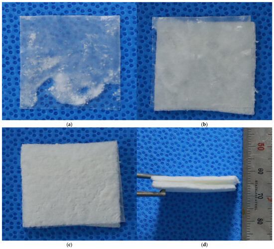 Tri-layered full-thickness artificial dermis. (a) Basement membrane. (b) Basement membrane and a cell scaffold. (c,d) Tri-layered full-thickness artificial dermis. The final tri-layered full-thickness artificial skin included SVF cell and keratinocyte scaffolds with a basement membrane between the two cell scaffolds.