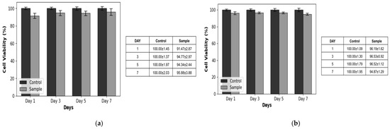Cell viability test results. (a) Keratinocytes. (b) SVF cells. The results revealed that the fabricated basement membrane was minimally toxic to both keratinocytes and SVF cells over the 7-day culture period.