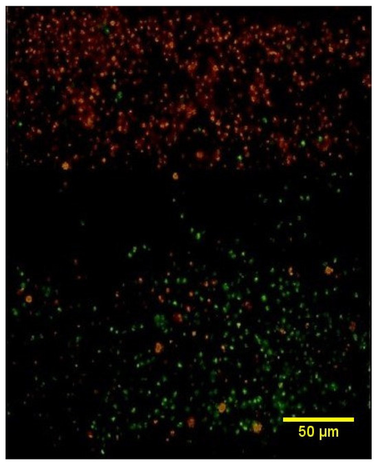 Cell imaging results confirmed the presence of red-stained keratinocytes in the epidermal layer and green-stained SVF cells in the dermal layer, with a basement membrane placed between the two layers. This configuration facilitated potential cell-to-cell interactions (Figure 8).