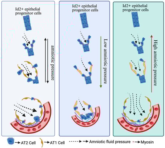 AT1/AT2 cell differentiation is a crucial process for lung development and is essential for maintaining optimal gaseous exchange. Abnormality in AT1/AT2 cell differentiation can trigger severe consequences, leading to a range of respiratory problems, including pulmonary fibrosis, emphysema, and lung cancer [40,41,42]. Researchers have demonstrated that fetal breathing movements drive amniotic fluid inhalation, which generates mechanical forces crucial for the differentiation of AT1 cells. These mechanical forces act as a key regulator that influences the differentiation trajectory of alveolar progenitor cells. A significant portion of these progenitor cells extend protrusions from the airway epithelium into the mesenchyme. This protrusion process is dependent on signaling via fibroblast growth factor 10 and FGF receptor 2 (FGF10/FGF2). The formation of these protrusions leads to myosin aggregation at the apical surface of protruding cells [43]. This apically concentrated myosin provides structural reinforcement, enabling the cells to withstand the mechanical forces imposed by the inhaled amniotic fluid (Figure 2). This resistance, in turn, facilitates the maintenance of the cuboidal morphology characteristic of these progenitor cells. AT2 cells have a limited alveolar epithelium surface area, and this, coupled with their apparent resistance to mechanical stress, suggests a specialized adaptation for survival in the dynamic lung environment. Hence, this myosin-mediated contractility ensures the protruding AT2 cells fate by preventing them from becoming flattened under the influence of mechanical forces. It also manifests that adult AT2 cells are superior at withstanding the mechanical force compared to AT1 cells [39]. Moreover, non-protruded alveolar progenitors differentiate into AT1 cells in the influence of fatal breathing mechanical forces at E17. Further results have demonstrated that FGF10 secreted by mesenchymal cells directs the Id2+ progenitor cell migration, proving that FGF10 is epitomized as a local chemotactic factor to trigger actin-based cell protrusion process. Moreover, they are synergistically controlling cell differentiation. In essence, mechanical cues shape cell morphology and fate, while growth factors provide directional guidance and proliferative signals, working in concert to orchestrate the complex process of alveolar development [39].