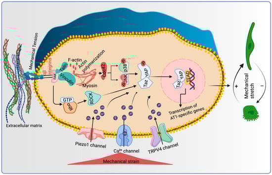 Mechanotransduction-mediated intracellular signaling plays an unwavering mechanistic role in AT2-AT1 differentiation. Mechanical forces generated from fluid pressure and shear stress act on the ECM, which transduces physical force to integrins present on the cell surface. Mechanosensitive focal adhesion proteins allow the integrin clustering, actin polymerization, and cytoskeletal remodeling that transmit forces upon the nuclear envelope, remarkably altering gene transcription. Furthermore, intracellular pathways are activated by the mechanotransduction process. Rho/ROCK and YAP-TAZ are central signaling that activate the transcription of AT1-specific genes. Mechanosensitive channels activate upon stress stimuli, increase the flow of Ca+ ions, and simultaneously regulate the YAP/TAZ nuclear shuttling, essential for AT1 cell phenotype.