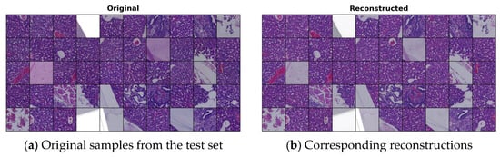 In this study, we used histopathology images of KPC mice as our research dataset. The Department of Surgery and Oncology at the Graduate School of Medical Sciences, Kyushu University, provided these images. The dataset is unlabeled and consists of images stained using the Hematoxylin and Eosin (HE) technique, which is the most commonly used staining method in histopathology for detailed visualization of cell structures and tissues. Hematoxylin stains the cell nuclei purple, while eosin stains the fibers pink []. The dataset contains a total of 11,000 images, of which 10,000 were used for training the model and 1000 were reserved for testing. All images have a resolution of 128 × 128 pixels.