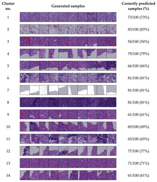 Figure 3 displays a selection of generated samples produced using the cluster IDs. We observe that these samples exhibit similar tissue patterns to the corresponding clusters shown in Figure 2. For most clusters, the model predicted the sample IDs with high accuracy—over 70%. In several clusters, the accuracy exceeds 60%, while only one cluster shows a lower accuracy of 54%.