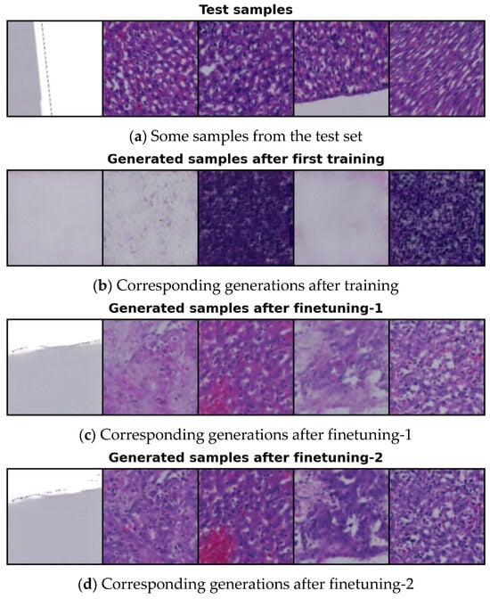 Comparison of conditionally generated samples: (a) random samples from the test set; (b) samples generated after initial training; (c) samples generated after finetuning-1; and (d) samples generated after finetuning-2.