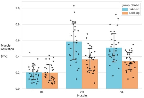 Regarding the differences observed between take-off and landing phases, we found that the activation of the Vasti muscles is much greater during the take-off phase, which aligns with the findings of Cerrah et al. (2014), who also reported maximum activation for these structures in the middle of the mentioned phase []. In contrast, the activation of the BF remained almost unchanged during this phase in our sample, which is consistent with the findings of Cone et al. (2021), who confirmed this difference between phases by noting a greater asymmetry in the distribution of vertical ground reaction force during the landing phase compared to the take-off phase []. In their study, Baratta et al. (1988) also observed greater activity of the quadriceps group, including the rectus femoris (RF), than the hamstring group during a functional movement, confirming the activation data from both studies indicating some co-activation of these muscle groups to provide necessary knee joint stability [].