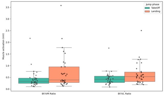 Regarding the BF/VM and BF/VL ratios, these did not follow a normal distribution in any of the jump phases. This might be related to the fact that some individuals are more prone than others to knee injuries, with it being well-established that certain values of these ratios can indicate a higher or lower predisposition to such injuries [,].