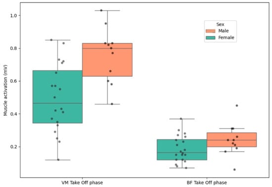 Sex-based differences in VM and BF activation during the take-off phase of the CMJ.