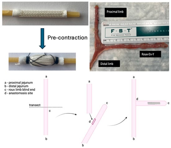 In seven Sprague-Dawley rats, a Roux-en-Y was constructed with 5-0 silk and measured in vivo along the mesenteric border with a ruler while lax and with no tension applied to the intestinal tissue. (Figure 1). After the creation of the roux limb, the precontracted IES device was inserted into the isolated intestinal limb and fixated to the intestinal wall using a 4-0 silk permanent suture at the ends. The absorbable suture holding the device in a precontracted state and the polymer support dissolved, allowing the device to re-expand. As the device re-expanded, the permanent suture maintained placement in the small bowel, and the force promoted ‘distraction enterogenesis’.