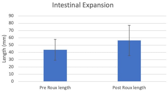 In this study the initial Roux-en-Y lengths were not all equal, ranging from lengths of 20 mm to 60 mm, largely due to the development of this new surgical technique to make the blind-ended roux limb for device placement. This made the standard deviation of the pre-IES and post-IES deployment lengths larger than what we anticipated. In future studies, we will have Roux-en-Y lengths set to a fixed standard to better determine the lengthening capacity of the 3 cm IES device. Also, the measurement of the Roux-en-Y lengths is subject to human error. Due to the nature of this device, a decrease in length is not expected unless a measurement error occurs or the IES device fails to deploy. Using this rat model, we are unable to fully gauge the discomfort of the IES device. However, as all animals maintained their weight and daily activity with no agitation during handling, we can conclude that they do not display overt pain or distress [].