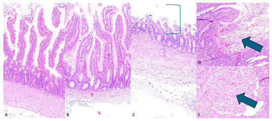 H&E intestinal histology. (A) (100×)—control Roux-en-Y with unremarkable intact small bowel, (B) (100×)—IES lengthened bowel with intact mucosal villi length and integrity, (C) (100×)—IES induced partial erosion of mucosa (mucosal erosion shown by bracket), with preserved basal/regenerative layer, (D) (100×)—intact intestinal mucosa with associated suture material (indicated by arrow), (E) (100×)—submucosal suture granuloma (indicated by arrow).