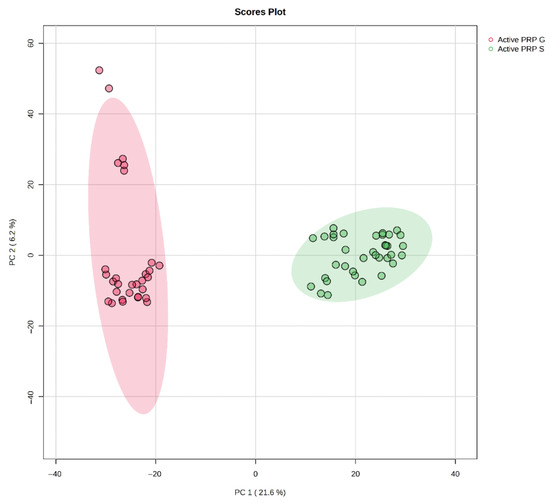PCA score plot showing distinct clustering of PRP-G and PRP-S samples.