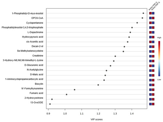 VIP score plot displaying the top metabolites contributing to the separation between PRP-G and PRP-S.