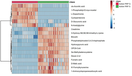Heatmap (VIP > 1) illustrating the relative abundance of key discriminative metabolites between PRP-G and PRP-S, with red indicating higher levels and blue indicating lower levels.