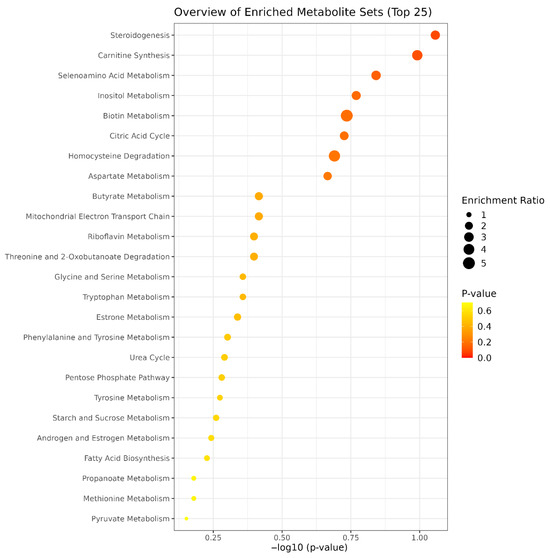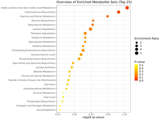 Enrichment analysis of significantly altered metabolites between PRP-G and PRP-S. Pathways are ranked based on statistical significance (−log10 p-value), with dot size indicating the enrichment ratio and color representing p-value intensity.
