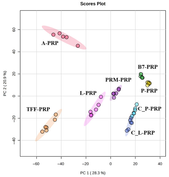 PCA score plot illustrating the separation of eight distinct PRP types prepared from a single donor.