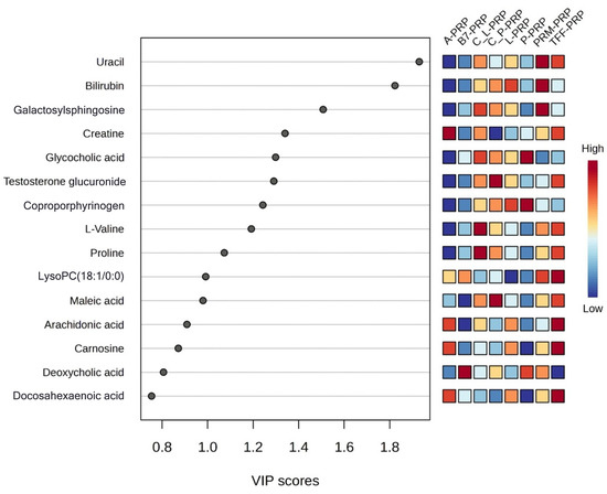 VIP score plot presenting the top metabolites responsible for the separation between different PRP preparation methods.