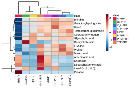 A heatmap was generated to visualize the concentration patterns of significant metabolites across the eight PRP types (Figure 7). The relative abundance of these metabolites varied widely among the different formulations, with certain profiles—such as those of A-PRP and TFF-PRP—showing elevated levels of specific compounds. These patterns further underscore the non-equivalence of PRP types, even when derived from the same individual, and reflect both the chemical selectivity of the kits and the influence of processing protocols.