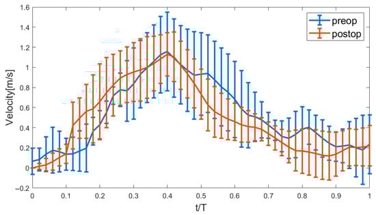 There was no significant difference in the entire cohort in the mean of the peak systolic aortic valve velocity pre- and post-surgery ( m/s vs. m/s, , Figure 1). Post-surgery reveals a notable reduction in the standard deviation of the peak velocity between peak systole and towards valve closure. This indicates a more uniform and stabilized flow profile following the surgical intervention.