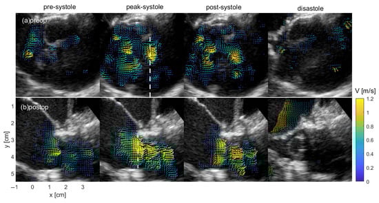 Transesophageal long-axis blood speckle imaging view of the left ventricular (LV) outflow tract and the aortic valve showing the blood flow velocity during different time instants of the cardiac cycle of Patient 1. The velocity vectors are colored with the velocity magnitude. The top of the image is posteriorly positioned towards the left atrium and the bottom is anteriorly positioned toward the right ventricle. (a) Pre-operative images are displayed across the top panels. (b) Post-operative images are displayed across the bottom panels.