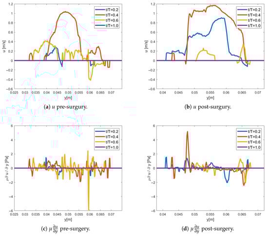 Axial velocity, u, and axial shear stress, , is shown pre- and post-surgery for Patient 1 at different instances of the cardiac cycle. The profiles are located along the white dashed line annotated in Figure 2. The y-direction corresponds to the short axis, where lower y-values indicate proximity to the anterior wall (higher up on the screen and closer to the TEE probe) and higher y-values indicate proximity to the posterior wall (further from the TEE probe).