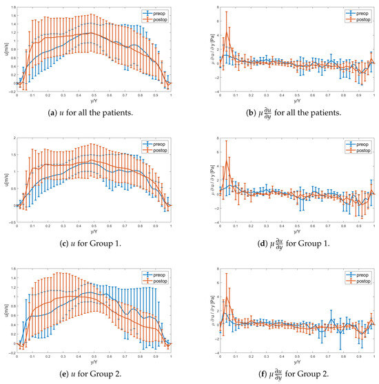 Figure 4 complements Figure 3 by illustrating the statistical mean and standard deviation for Patients 1–10 at peak systole. Pre-operatively, the impaired flow is evident towards the right/left coronary leaflets, with the jet directed more anteriorly, c.f., Figure 3a,b. Post-operatively, the statistics indicate a fuller velocity profile at peak systole, with larger velocities directed anteriorly towards the probe. The greater asymmetry observed pre-operatively causes a reduced velocity gradient on this side compared to the post-operative case, resulting in lower axial wall shear stress and indicating a tendency for retrograde flow; see Figure 4b. On the opposite side (), i.e., the posterior aortic wall, the gradient is similarly small with low axial velocity, with some patients indicating changed sign of the wall shear stress, implying flow reversal pre-operatively as compared to the post-operative case.