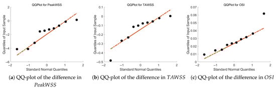 The difference in these parameters is given in quantile–quantile (Q-Q) plots in Figure 5 and shows that the data falls on a straight line, indicating normally distributed data.